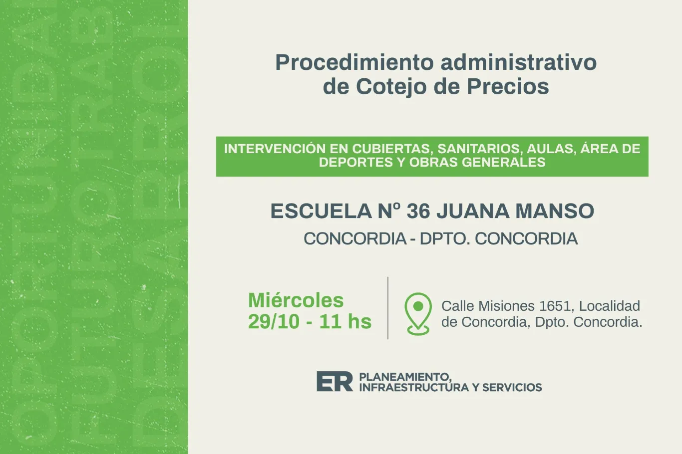 Con trabajos de reparación edilicia, mejoras en los sanitarios, cubiertas de techo y la puesta en valor del espacio deportivo, se intervendrá la escuela Nº 36 Juana Manso de la ciudad de Concordia y beneficiarán a más de 560 estudiantes.